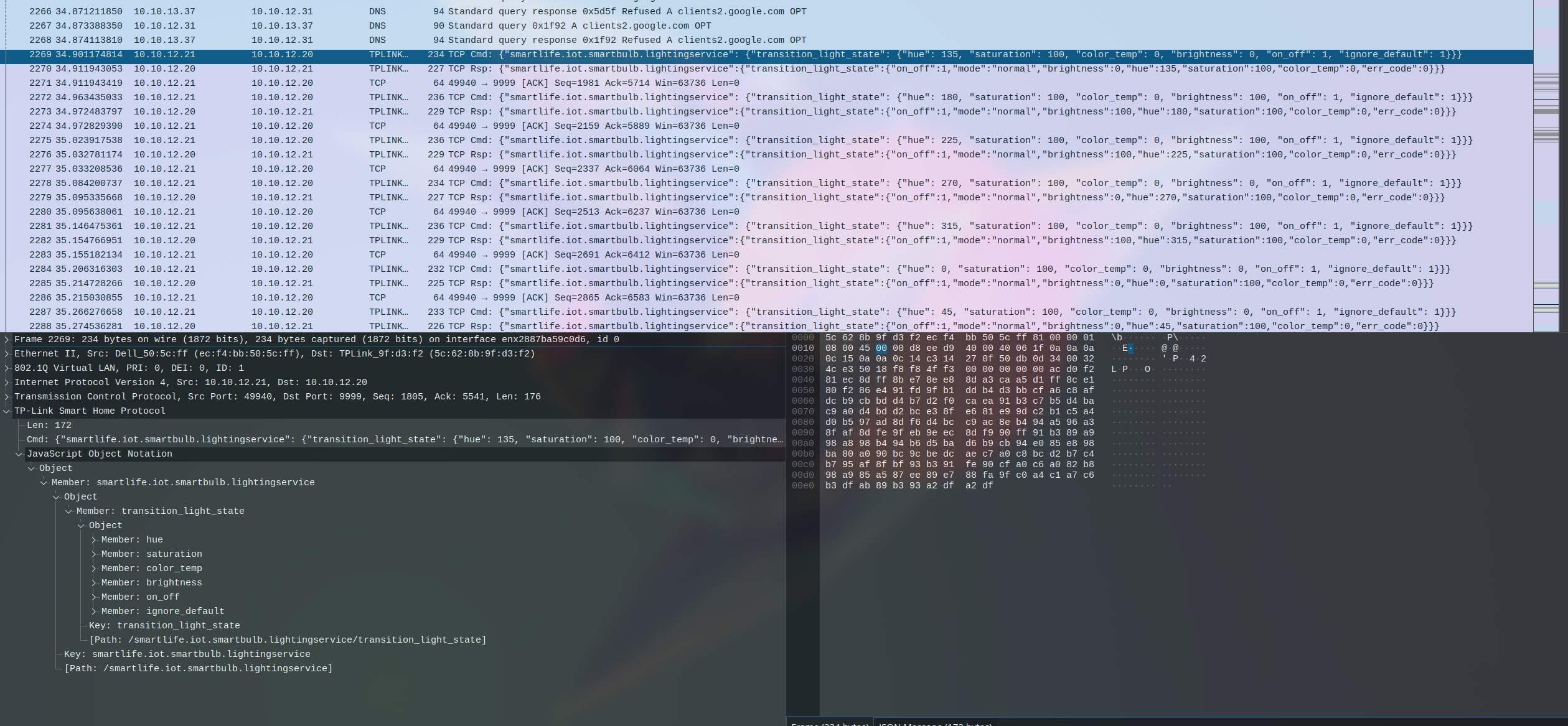 is working, and the brightness is being set high for 1’s and low for 0’s, so we can use that to extract the original data! We can apply a quick filter (((ip.dst == 10.10.12.20) && (ip.src == 10.10.12.21)) && (_ws.col.protocol == "TPLINK-SMARTHOME/JSON")